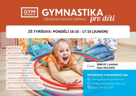 GYMNASTIKA PRO DĚTI je pro všechny kluky a holky z 1. stupně. Hlavní náplní je všeobecná sportovní příprava se zaměřením na gymnastiku. Naučíme se kotouly, hvězdy i stojky, zacvičíme si na nářadí a zahrajeme si spoustu her. Děti budou rovíjet koordinaci, rychlost, vytrvalost a flexibilitu. Trenér si vyzvedne děti před začátkem lekce v družině a po lekci odvede zpět, nebo děti předá rodičům.
